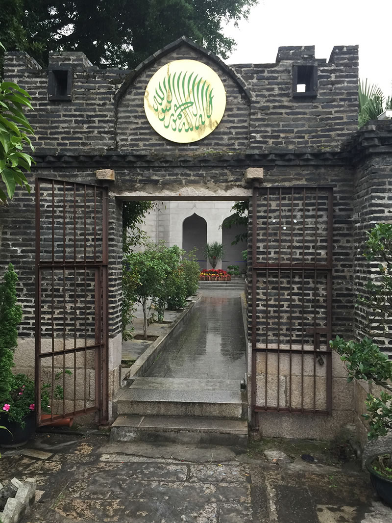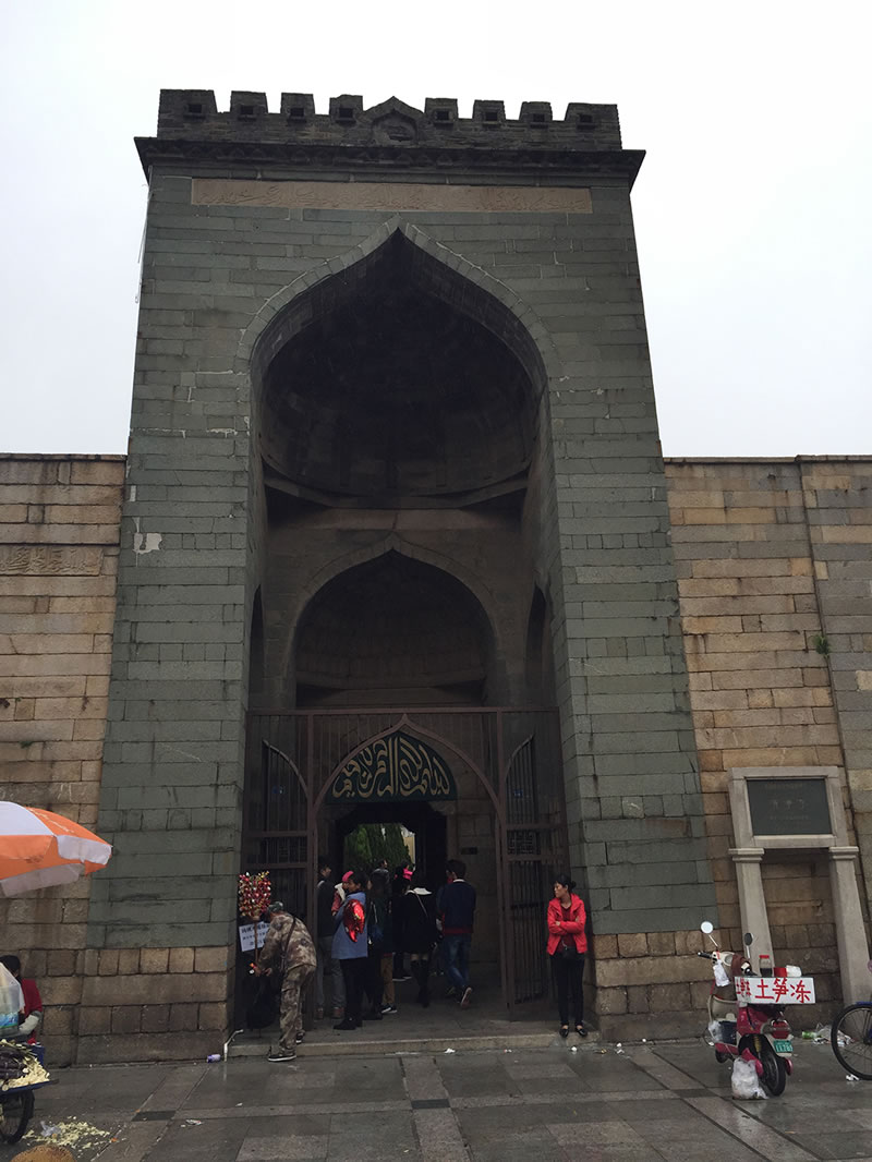 門樓:大門樓的外觀具有傳統的阿拉伯伊斯蘭教建築形式。大門朝南,入口凹進,高12.3米,基寬6.60米,門寬3.80米,用輝綠岩條石砌築,分外、中、內三重。除了第三重為磚砌圓頂,第一、二重皆為青石作圓形穹頂拱門,有著和中國古建築的“藻井”相類似的石構圖案,第一尖拱大門穹頂正中銜接外層,倒懸一朵雕刻精緻的輝綠岩蓮花。以此垂蓮為中心,砌嵌成放射狀,由上端沿外層各側延伸,有如蜘蛛網狀拱形寶蓋。表示伊斯蘭教崇尚聖潔清淨,門樓正額橫嵌阿拉伯文浮雕石刻,寫道:“真主秉公作證,除他外,絕無應受崇拜的;眾天神和一般學者,也這樣作證,除他外,絕無應受崇拜的,他是萬能的,是至睿的,真主所喜悅的宗教,確是伊斯蘭教。”中層輝綠岩尖拱門內的結構,是用花崗岩精工雕砌成半穹窿形。穹窿壁上,砌飾著層層疊疊87個精工雕琢的小型尖拱,狀似蜂巢。連同門樓東西兩牆砌飾的8個巨大尖拱壁門、壁龕,以及構成門樓分成3層的4道尖拱大門,整座門欞共有大小尖拱99個,象徵讚頌真主的99個尊美之名。門樓內層為石砌正方形,東西兩壁各砌飾一巨大尖拱壁龕。上部為青磚塊圈築的圓形大穹頂,塗堊潔白,無任何裝飾,象徵無限宇宙空間。