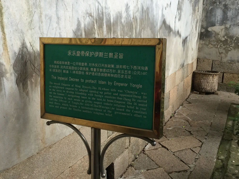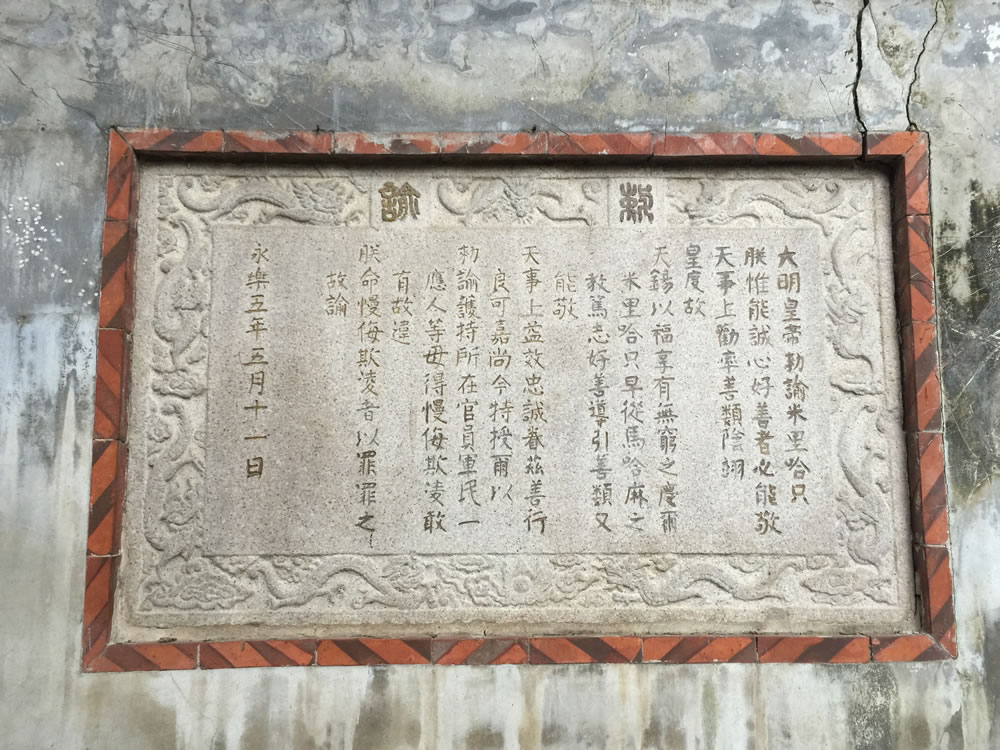 敕諭:寺門內北面圍牆正中,完好無損地鑲嵌著一方明永樂五年(1407年)刻有《永樂上諭》的石刻,是明成祖朱埭頒發保護伊斯蘭教寺院的文告。碑石高100釐米、長160釐米,四周邊框繞刻浮雕龍飾;上框正中雕刻一條張牙舞爪的蟠龍,左右篆刻“敕”“諭”,兩條奔龍從左右朝敕諭飛舞。左、右邊框各雕刻一奔龍,下框為雙龍戲珠。