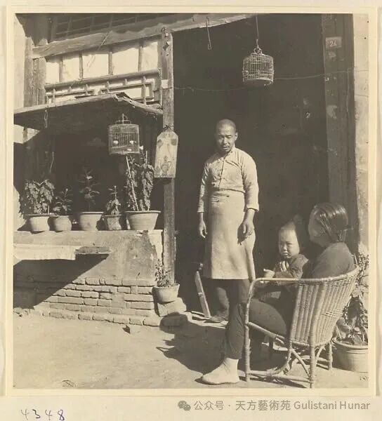 赫達·莫里森攝於1940年代的保定,鳥籠旁邊的木牌上是清真湯瓶教門牌,哈佛燕京圖書館藏。