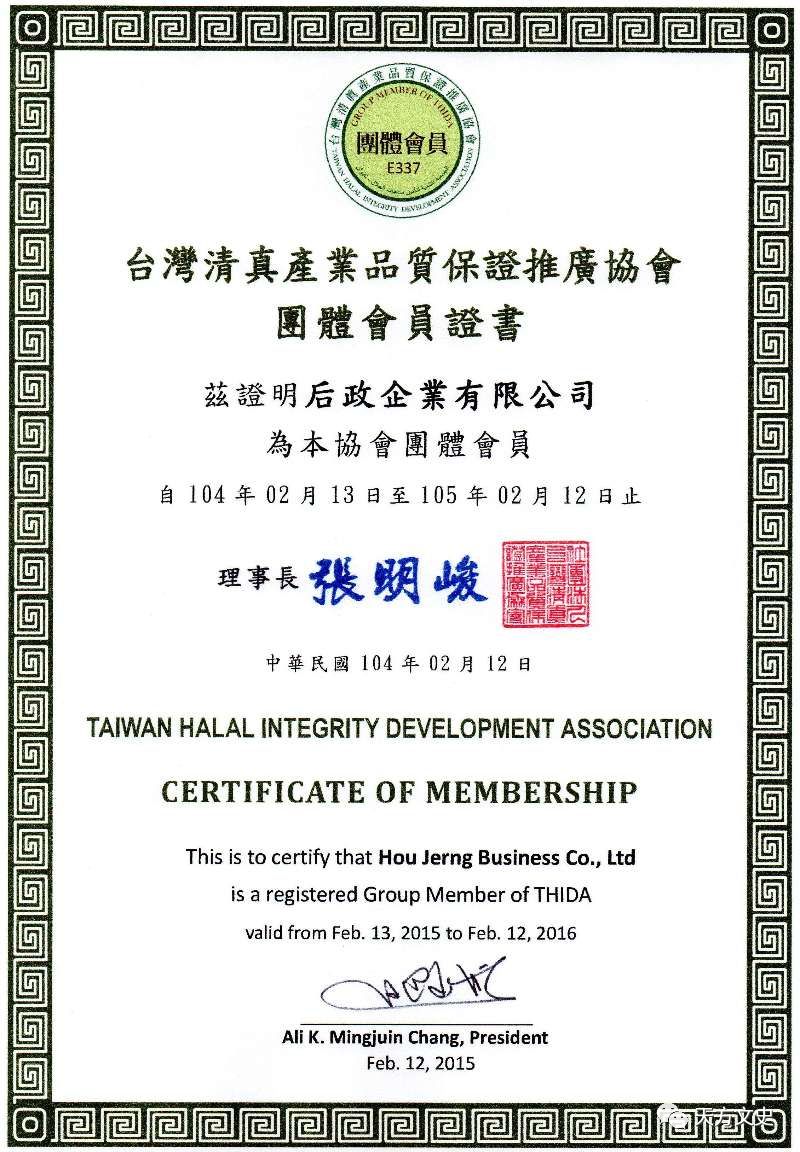 2005年,臺北清真寺成立財團法人基金會,“中國回教協會”的清真食(用)品商標轉由臺北清真寺基金會辦理,授權臺北清真寺基金會和高雄清真寺、桃園龍崗清真寺進行清真認證工作。2011年另成立“臺灣清真產業品質保證推廣協會”成立,設于臺北文化清真寺,與“中國回教協會”協商就清真認證事務分工合作,凡餐旅業、屠宰業、肉品供應類及臺灣穆斯林身份等認證事務由“中國回教協會”認證,凡加工食品、生鮮果蔬類清真認證由“臺灣清真產業品質保證推廣協會”認證。現“中國回教協會”和“臺灣清真產業品質保證推廣協會”的清真認證已獲得世界多個清真食品認證協會的認可,並成為總部設在印尼的“世界清真食品理事會”會員。