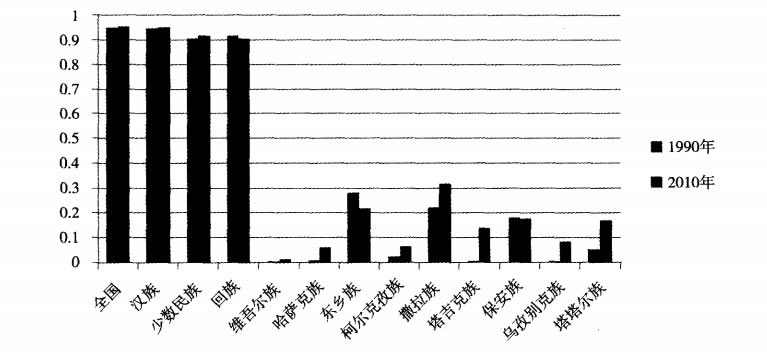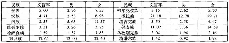 穆斯林民族由於宗教的原因,對婦女的約束過多,使婦女參與文化教育的機會降低,因此婦女的文盲率比其他民族更高,在2010年人口普查中東鄉族、保安族和撒拉族的婦女文盲率都在20%以上,處於較高的水準;其中撒拉族婦女的文盲率最高(見表4)。