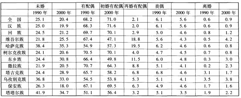 穆斯林民族早婚的現象雖然比解放前有所減少,但目前在農村仍是一個突出的問題。在第六次人口普查中有7個穆斯林民族的未婚率低於全國平均水準,說明這些民族不同程度地存在早婚現象。