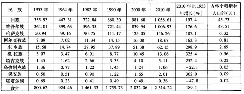 我國信仰伊斯蘭教的穆斯林民族共有10個,他們是:回族、維吾爾族、哈薩克族、柯爾克孜族、東鄉族、撒拉族、塔吉克族、烏孜別克族、保安族、塔塔爾族,主要分佈在西北五省區。西北五省區的穆斯林人口占全國穆斯林人口的75%。五省區中又以新疆為最多,10個信仰穆斯林的民族中7個都主要分佈在新疆。新疆穆斯林人口占全國穆斯林人口的52.4%,在新疆少數民族中96.99%的人口信仰伊斯蘭教。據2010年第六次人口普查統計,10個信仰伊斯蘭教的民族共計人口為2 314.22萬,占全國少數民族人口的20.3%,亦即五分之一左右,他們的人口變化對整個少數民族人口的發展有舉足輕重的影響。