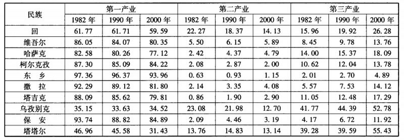 穆斯林民族善於經商,分民族從事第三產業的人口比例中,有5個民族從事第三產業的人口超過了15%,他們是烏孜別克、塔塔爾、回、哈薩克和塔吉克。也有一些民族行業、職業構成都很差,例如東鄉族、保安族和撒拉族,這與他們分佈的地理、自然環境差,大都居住邊遠的農村,經濟收入低文化素質又不高有關。這3個民族從事農牧業的人口百分比都在90%左右,最高的東鄉族競達96%(見表7)。