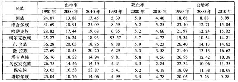 穆斯林民族人口的增長,主要是自然增長。這種高增長的主要原因有早婚早育和高出生率。在許多地方,穆斯林民族人口的生育指標都超過了國家的規定,而且超過的幅度大大高於漢族。這與民族的文化構成和生育意願有關,穆斯林民族在生育觀念上除了有養兒防老、解決勞動力短缺等一般要求外,還有宗教上擴充人口的意識。如:女兒一般不外嫁,與外族通婚要男方加入穆斯林等。男方要外族女子做妻子,妻子也必須皈依伊斯蘭教。10個穆斯林民族人口增長狀況見表1。