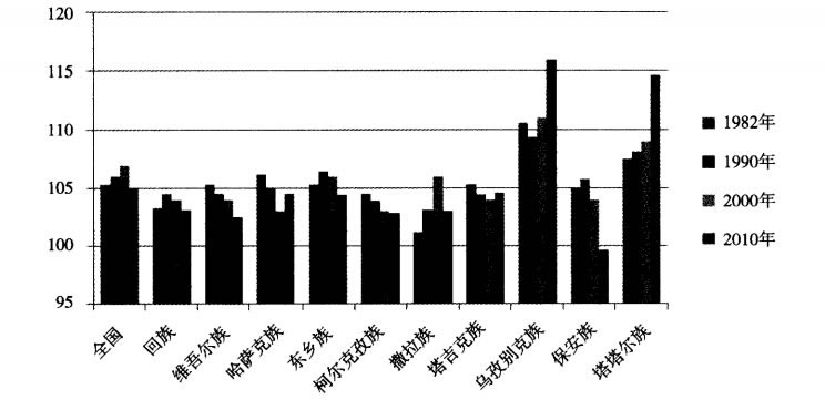 穆斯林民族不溺女嬰,所以出生人口性別比較低。在這次人口普查中,穆斯林民族人口的出生性別比均低於全國平均水準(見圖2)。