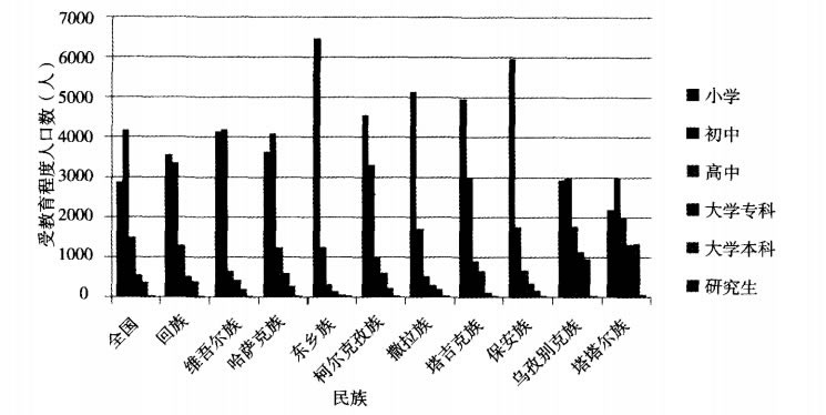 從表3中我們可以看到,有些人口少的穆斯林民族文化程度高,如烏孜別克族、塔塔爾族人均受教育年限最長,未受教育人口比率最低。這與國家在大學招生和中小學入學優惠等政策有關,人數少優惠政策的效益就明顯。另外東鄉族的文化構成很差,是全國唯一一個受教育年限在6年以下的民族。這個現象由來已久,這與該民族分佈有關,都集中在東鄉縣的農村,城鎮人口很少,經濟又落後,教育事業發展緩慢,所以文化素質差的現象很突出。