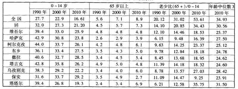 據2010年“六普”統計,穆斯林10個民族人口的年齡構成仍呈年輕型。0~14歲人口的比重均高於全國平均水準,65歲以上人口比例普遍偏低,社會負擔係數高,少年兒童負擔係數高,年齡構成均較年輕。