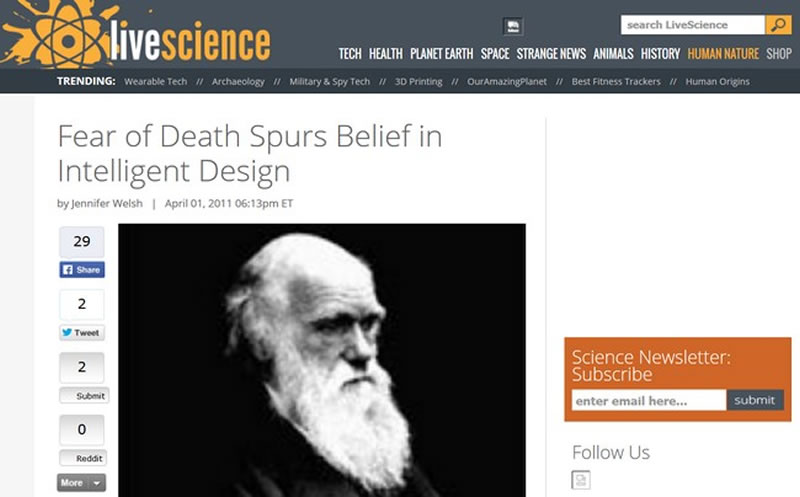 在不列顛哥倫比亞省和聯合學院(斯克內克塔迪,紐約)大學的研究人員發現,人的“死亡焦慮”可使他們支持智慧設計理論,拒絕進化理論。