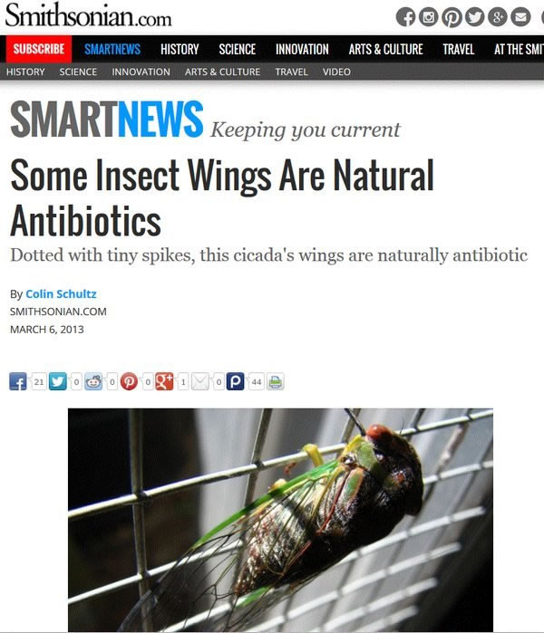 科研者對生活在澳大利亞的昆蟲翅膀(透明的蟬翼)( Clear Wing Cicada)的研究,這種昆蟲具有較長的翅膀(蠅科的一種),研究發現這種翅膀帶有殺死細菌的很強的藥物,以説明昆蟲殺死細菌和病毒。