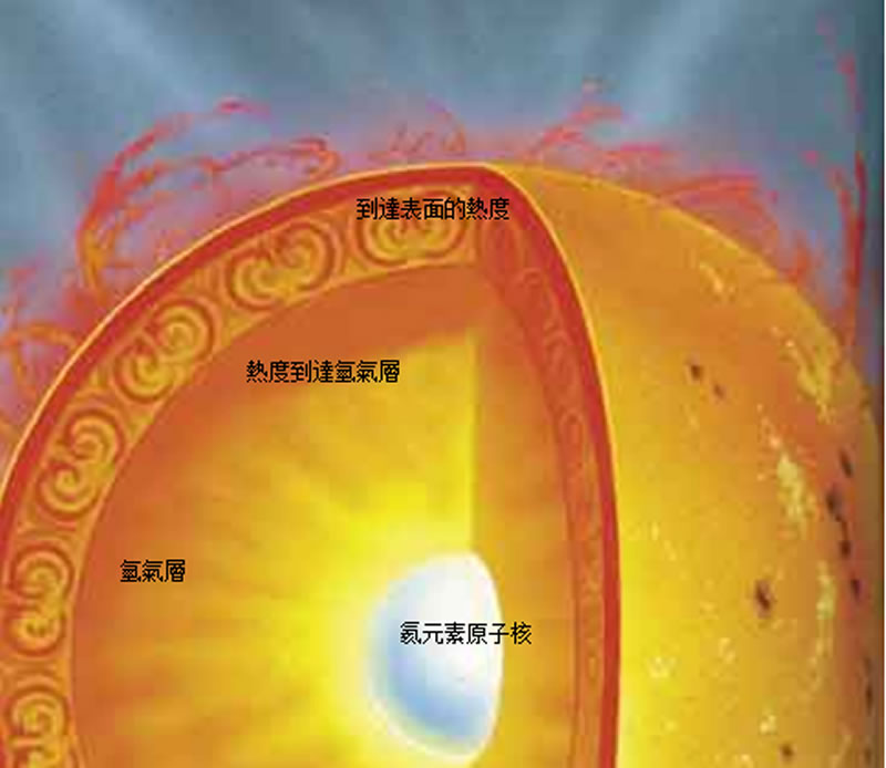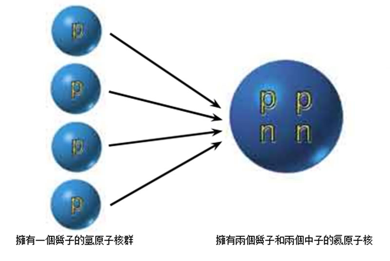 正如在紅色巨星上發生的那樣, 太陽內部的核反應也是意 想不到的一個工序° 任意旋轉的四個氫原子碰到一塊形成氦原 子是不可能的° 因此, 如同在紅色巨星上發生的那樣, 它的形成 有兩道工序° 首先兩個氫原子結合到一起形成一個擁有一個質子和一個中子的 “過渡結構” ° 這個過渡結構被稱作為 “ 重氫核°”