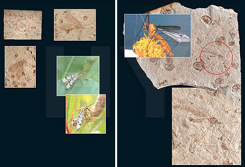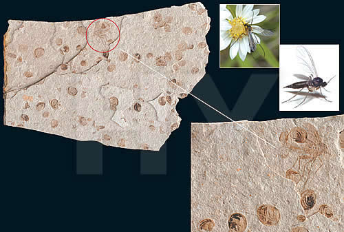 圖中的蕈蚊化石有1.28億年歷史,它們和現代的蕈蚊一樣。化石記錄表明蕈蚊一直保持不變,這個事實證明了它們不是從其他物種進化來的。 |