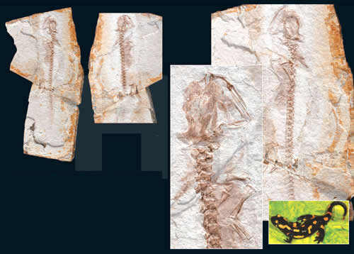 圖中的火蜥蜴化石有2.08億到到6500萬年的歷史,它們在百萬年間都沒有發生變化。火蜥蜴化石和現代的火蜥蜴在結構上沒有區別,這就證明了進化論者提出的進化過程根本沒有發生。 |