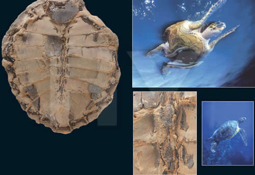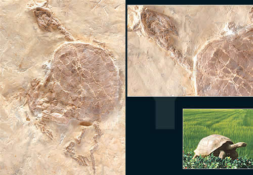科學發現表明生物沒有進化,而進化論者卻對此視而不見。圖中的化石是生活在1.46億年到6500萬年之間的海龜,它與現代的海龜一樣,這個事實再一次強調了進化論者不願意正視的結論:“生物在百萬年中沒有任何變化,換句話說,它們沒有進化。 |