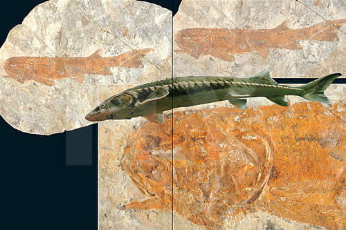 化石表明,魚和其他綱的生物一樣都是突然出現的,出現時就已經具有了它們現有的結構和完美的解剖學特徵。這件年齡在1.46億年到6500萬年之間的鱘魚化石與現代的鱘魚沒有什麽不同就是例子。 |