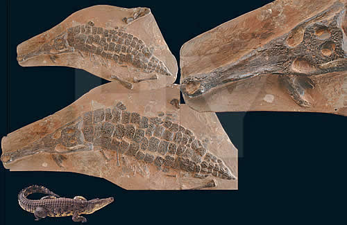 鱷魚化石比較多。它們突然在地球上出現,當時就具有完美無缺的結構(鱷魚化石可以追溯到1.4億年前),並且一直保持該形狀到了現在。圖中1億年前的化石鱷魚和現代的鱷魚在構造上沒有區別,這就是證明。 |