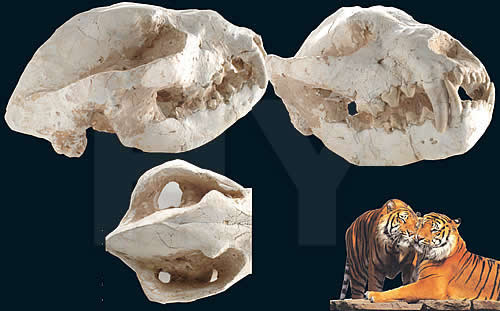 圖中的老虎頭骨有2000萬年的歷史,它們具有的特徵和現在的老虎一樣。百萬年過去,它們的骨結構還是保持不變,這一事實否定了進化論。 |