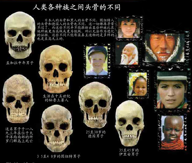 同理,不同種族的人類也有不同的頭骨結構。侏儒和英國人、俄羅斯人和中國人、澳洲的土著人和因紐特人或黑人和日本人,他們的前額結構、眼窩、眉骨、和頭骨體積都是不一樣的。但這些不同並不意味著一個種族或進化未另一個種族,也不能說具體哪一個種族比其他任何一個種族“更低級”或“更高級”。