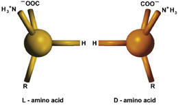 實際上,存在兩種不同類型的氨基酸,一種是“左手型”氨基酸,一種是“右手型”氨基酸。這兩種氨基酸之間的不同就是它們三維結構中的鏡像對稱性,類似於人的左右手。 |