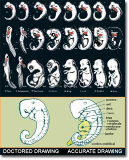海克爾僞造了這些圖紙,以圖證明人胚胎和魚胚胎之間的“相似性”。把他的圖和真正的人類胚胎做比較,就可以看到他故意忽略了大部分實際器官。 (Francis Hitching, The Neck of the Giraffe: Where Darwin Went Wrong, p. 205)