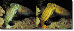 烏賊的皮下分佈著富有彈性的厚厚的色囊層,叫做“色素胞”。這些色素主要是黃色、紅色、黑色和棕色。收到信號後,細胞擴散,以適當的顔色護住皮膚。烏賊就這樣呈現出與它所落腳的岩石相同的顔色,完成了出色的僞裝。