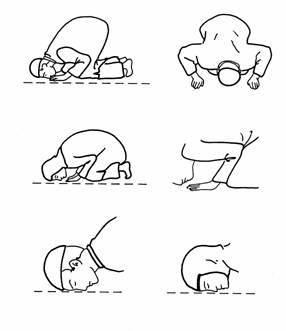 (兩手捉住兩膝,平背直腰,眼看兩腳面)