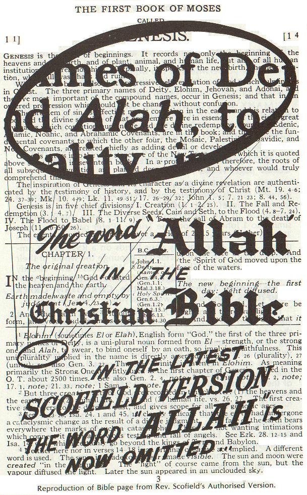 神學博士史考非爾德牧師,和一個八人編輯小組(均是神學博士)在「史考參考聖經」(Scofield Reference Bible)中,認為希伯來字「Elah」(意為上帝),應寫成「Alah」,基督徒對此並不計較,--似乎終於接受了上帝的名字是Allah--卻斤斤較量Allah中只用一個「L」,(請參閱左圖影本),作者將此一事實公諸大眾,可是後來出版的「史考參考聖經」,保留了創世紀第一章第一節的註釋全文,一字未變,但以巧妙手法,獨將「Alah」一字漏掉,彌補的天衣無縫,這是發生在正統聖經中的事!對於他們的這種手法,我們實在望塵莫及。