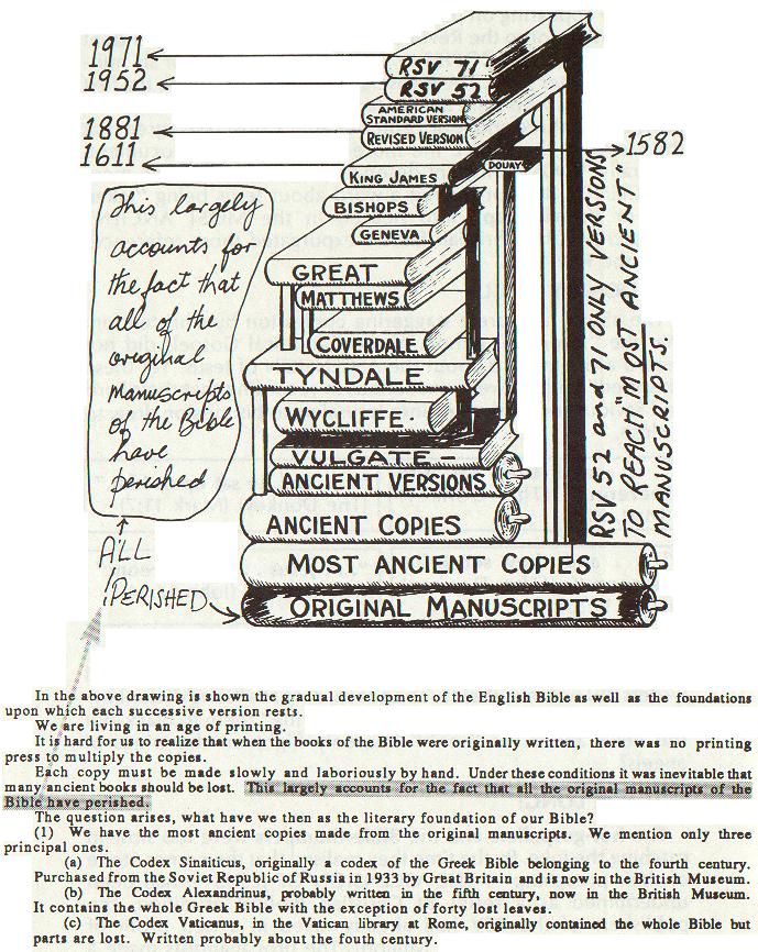在下面「英文聖經之成長及來源」圖解中,你會發現,在1881年以前所有的聖經版本,都是一句「古老的手抄本」(Ancient Copies)--這些都是耶穌死後五、六百年的抄本。1952年RSV版的修訂者乃第一批完全接觸到「最古老的手抄本」(Most Ancient Copies)的聖經學者,這些手抄本是耶穌死後三、四百年的抄本,我們同意,文獻越古老,真實性越大,所以「最」古老的當然比「古老的」有價值,可是在最古老的手抄本中,卻發現不到有關耶穌「被帶到天上」的字樣,所以基督教的神父們就從RSV 1952年版中刪除了那些字句。