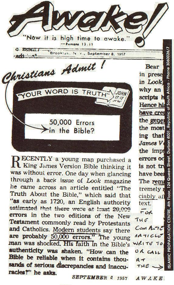 耶和華見證會1957年9月8日,在他們的「醒來!」(Awake!)雜誌有一個駭人驚聞的標題:---「聖經中有五萬個錯誤?」