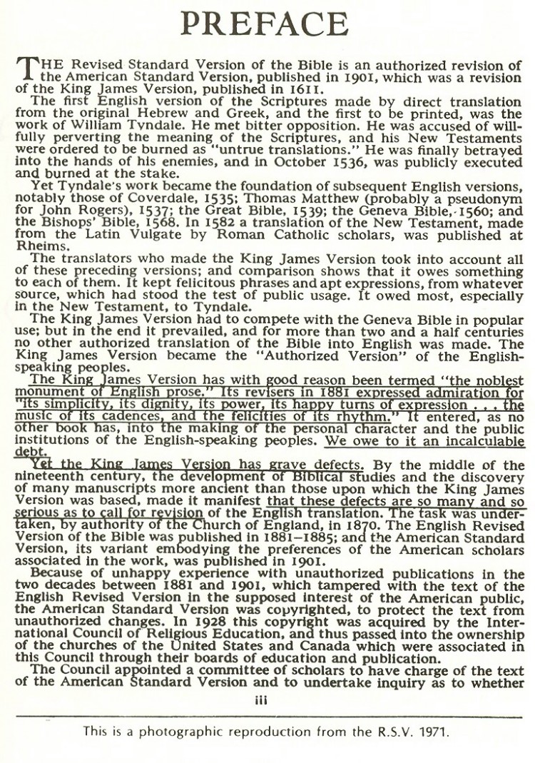 正如邱吉爾爵士所說,第一次出版於1611年,1811年修正版(RV)出版,1952年再加修正成「修正標準版」(RSV)沿用迄今,1971年又再加修正(仍用RSV之名),關於這個一再修正的「修正標準版」(RSV),容我們看看基督教會的意見: